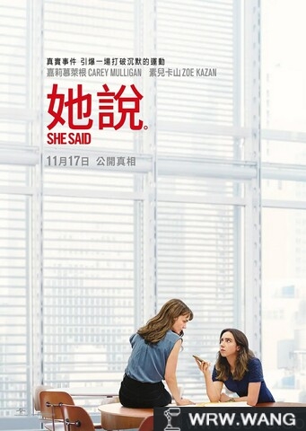 故事聚焦《纽约时报》女记者乔迪·坎托尔(佐伊·卡赞 饰)与梅根·吐赫(凯瑞·穆里根 饰),她们联手撰写了这个世代最重要的一篇报道,进而引发#MeToo运动,不但揭发了好莱坞数十年来默许的性侵真相,也永远改变了美国文化。
